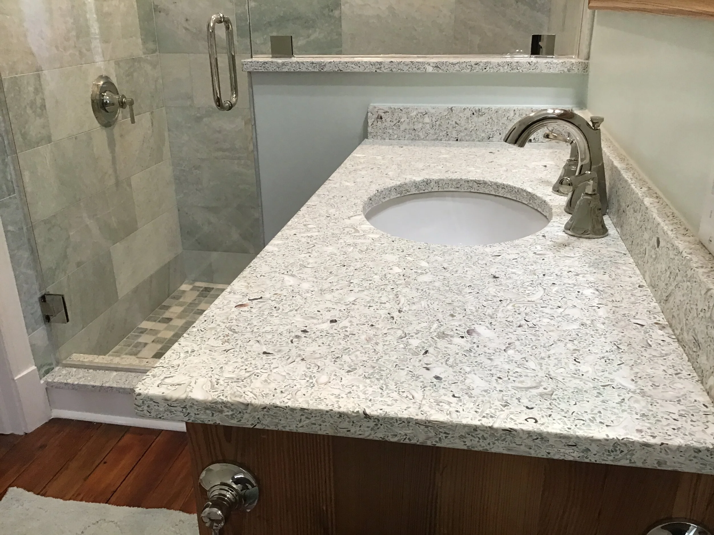 We utilize a mixture of cement Mussel Shell Clam Shell and recycled Glass for a durable attractive counter top vanity or tabletop.